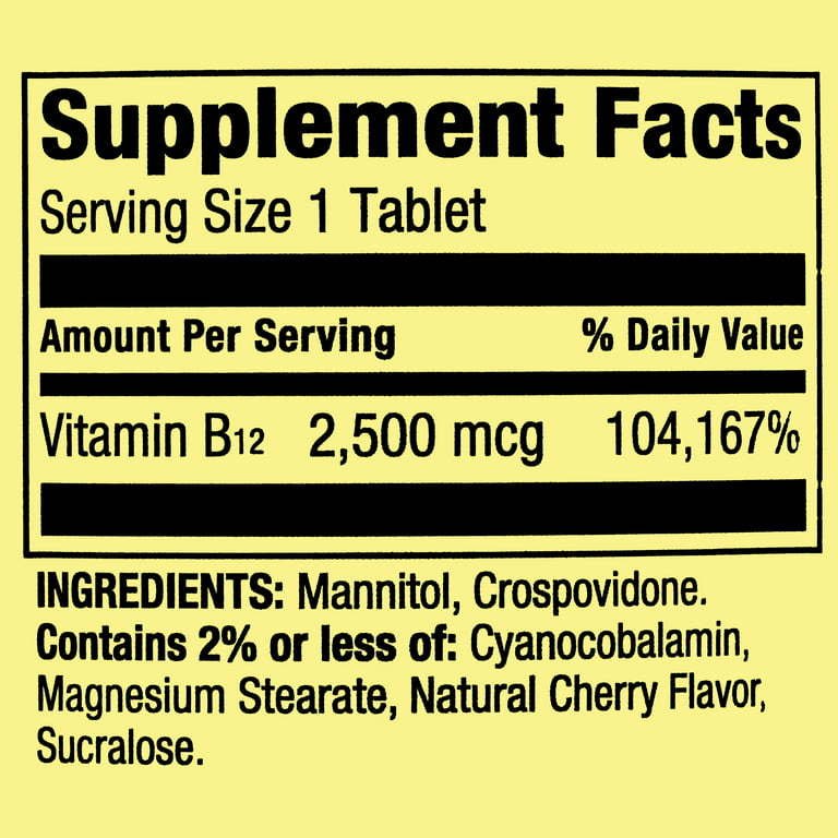 Spring Valley Vitamin B12 Quick-Dissolve Tablets Dietary Supplement, 2,500 Mcg, Cherry Flavor, 120 Count Spring Valley Vitamin B12 Quick-Dissolve Tablets Dietary Supplement, 2,500 Mcg, Cherry Flavor, 120 Count Spring Valley Vitamin B12 Quick-Dissolve Tablets Dietary Supplement, 2,500 Mcg, Cherry Flavor, 120 Count